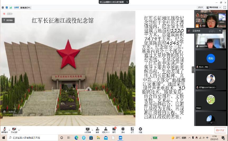 会上还对桂林八路军办事处、红军长征湘江战役纪念园、湘江战役新圩阻击站酒海井红军纪念园、百色起义纪念馆、龙州起义纪念馆等红色教育基地进行介绍,通过线上学习的方式永远铭记他们的牺牲和奉献,学习他们的精神,汲取奋斗的力量。