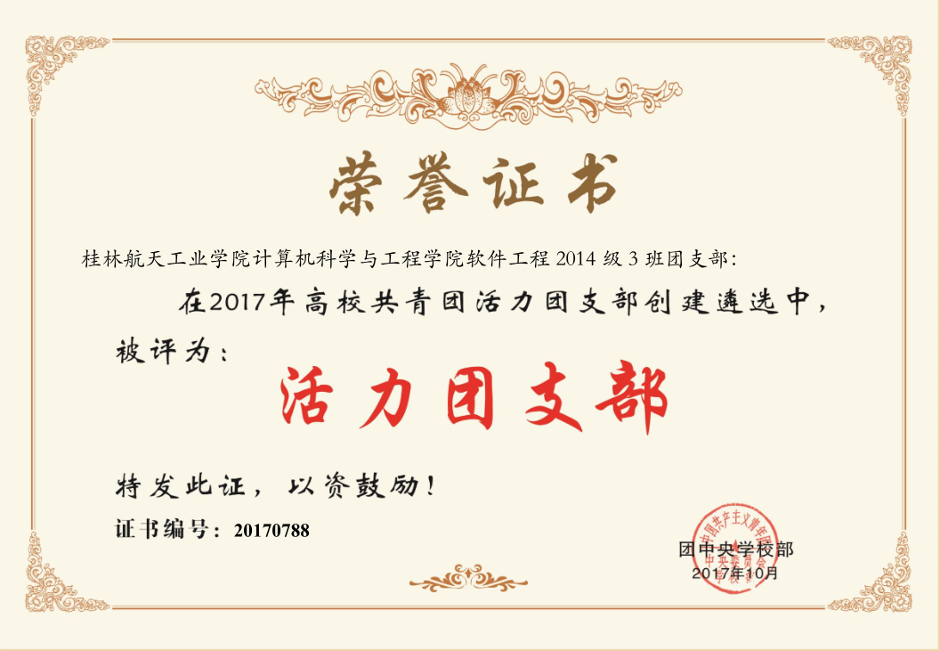 2014级软件工程3班团支部是一个充满活力、团结友爱的集体,在支部成员的共同努力下,连续两年获得校级先进班集体。2017年,获得校级五四红旗团支部的荣誉称号。
