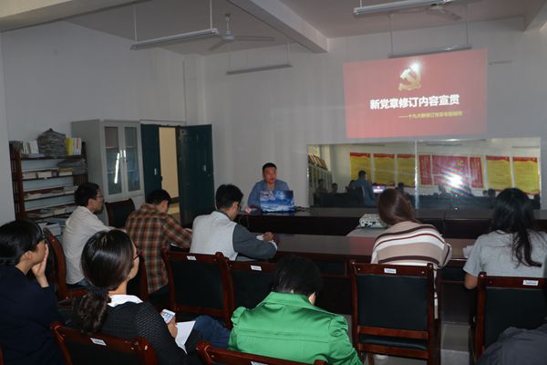 邓书记从党章总纲和具体条文两个方面,对党章新修订的十项主要内容上进行了详细地讲解。他指出,党章中把习近平新时代中国特色社会主义思想同马克思列宁主义、毛泽东思想、邓小平理论、“三个代表”重要思想、科学发展观一道确立为党的行动指南。中国特色社会主义已经进入了新时代,我国社会主要矛盾已经转化为人民日益增长的美好生活需要和不平衡不充分的发展之间的矛盾,我们党面临着新的形势和任务,肩负着新的历史使命。作为高校教师,作为培养社会主义建设人才的工作者,大家要认真学习和全面贯彻党的十九大精神,尤其是党员同志,要认真学习新党章,紧密结合思想和工作实际,努力做到工作自信、生活自省,全力迎接公司的本科教学质量合格评估工作。